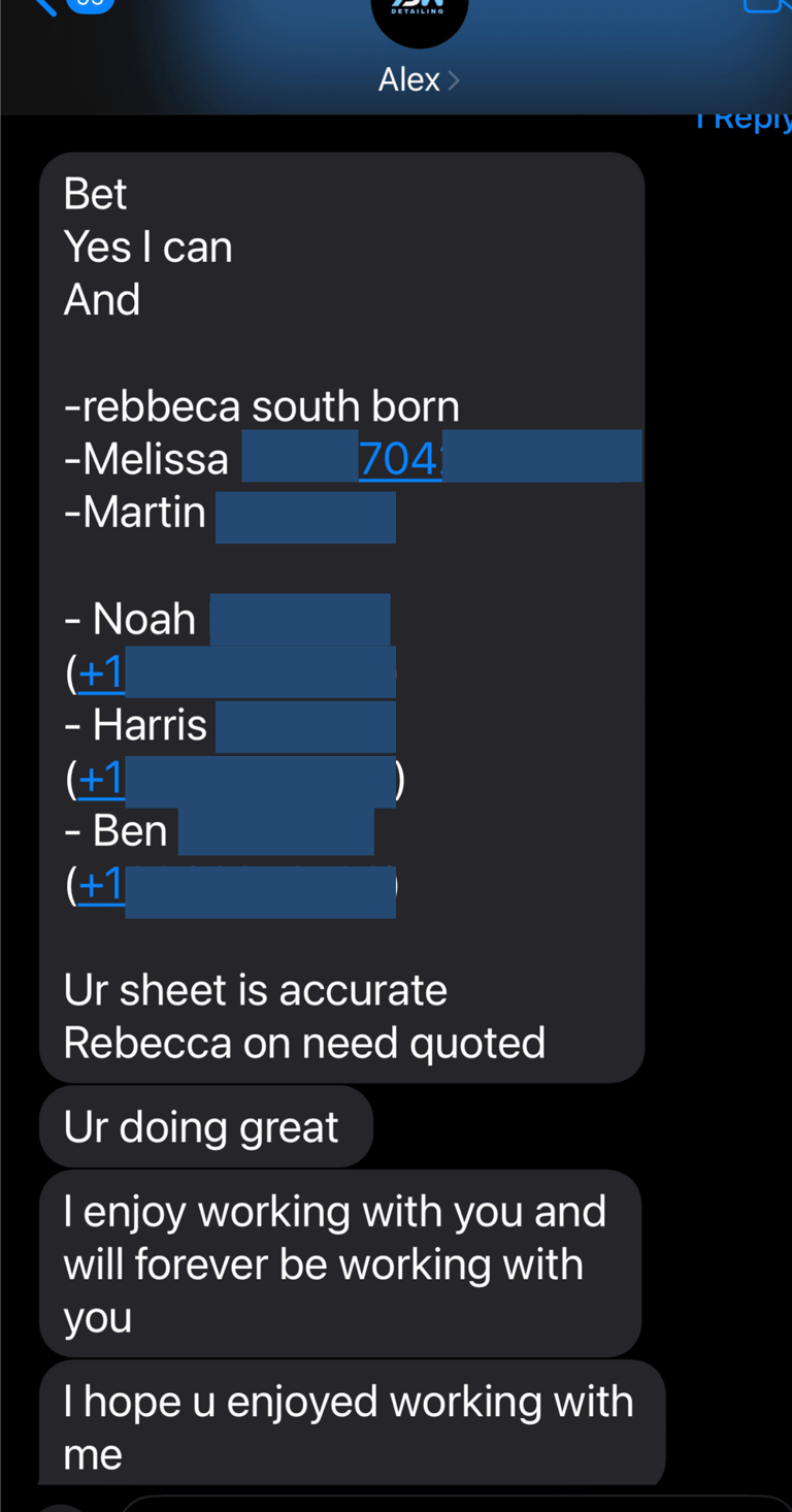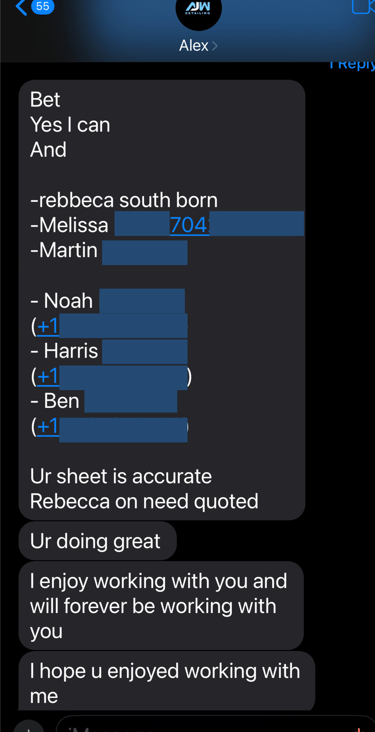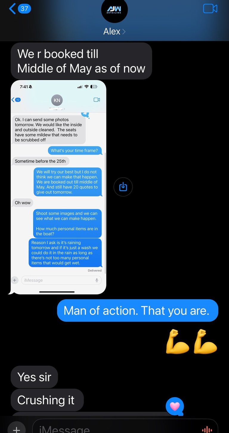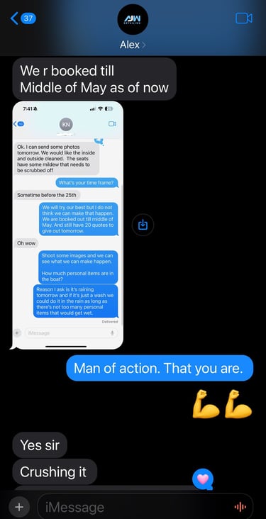 "You crushed it at everything. You helped me see a lot of areas where I can improve. You helped me see a new vision and the power of marketing. Also, I loved the website design and everything you did. Cuz we're booked till June, 2025, and I have 20 quotes to do!"